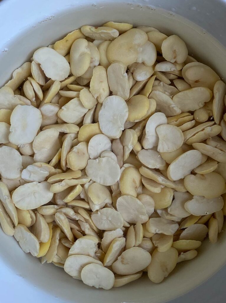Broad beans: seeds of an erect stem plant, Vicia Faba, which grows throughout the Mediterranean basin. Pulses, such as chickpeas, beans, lentils and broad beans, were abundant in Etruscan cooking which is the mother of Mediterranean cuisine. They were the daily food staple and were cultivated mainly for the use by the family rather than for selling.