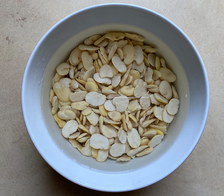 Soak the dried broad beans overnight. Rinse them well under running water before placing them in a saucepan with plenty of water together with an unpeeled clove of garlic and a pinch of coarse salt. Bring the water boil over a very low heat.