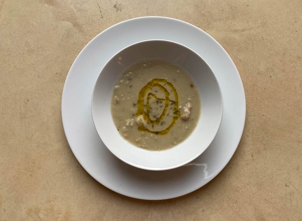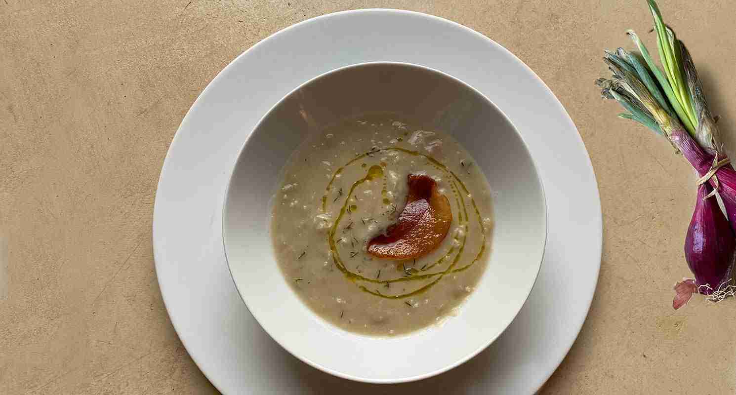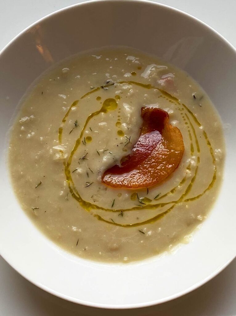 Remove and set aside the fried rigatino or bacon. To flavor the broad beans, place them in the same frying pan and simmer over low heat. If you would like the soup to be less thick, then add the cup of cooking water and gently stir. Before serving, garnish each plate with a slice of bacon, a generous drizzle of Olea Prilis EVOO and a few fresh thyme leaves.