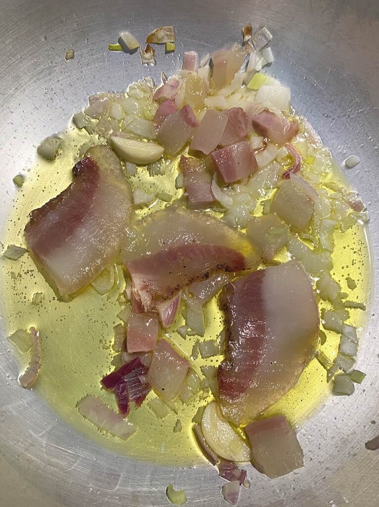 - 2 cloves of garlic: 1 for cooking the beans and 1 for browning the bacon