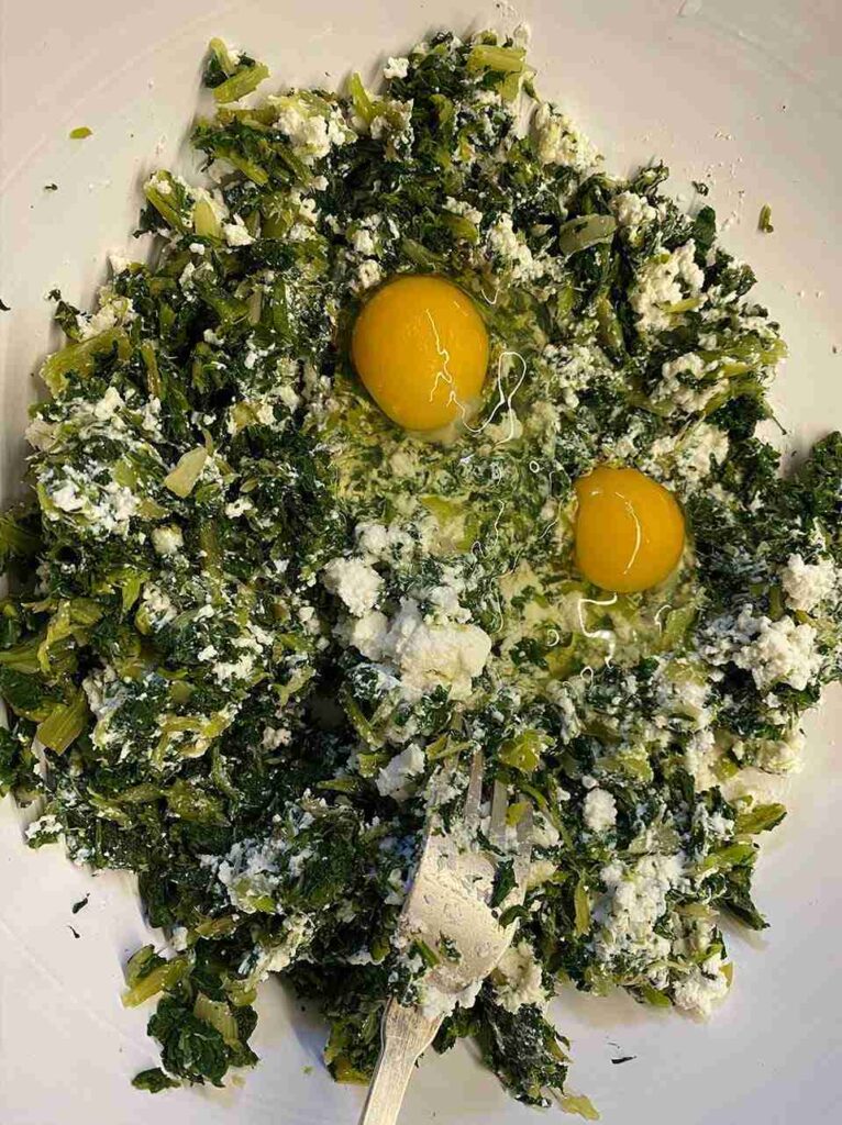 Now place the chard in a large bowl and mix it with the ricotta cheese – with the whey already drained off – two eggs, 100 grams of grated pecorino cheese and two or three tablespoons of flour.