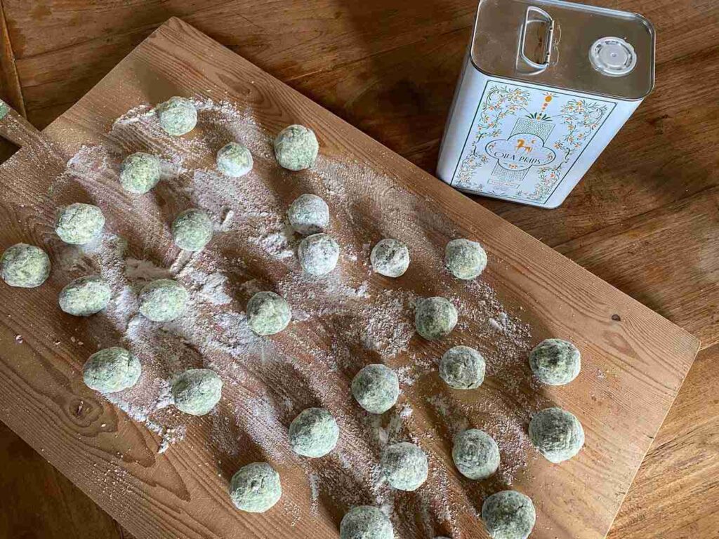 Once you’ve got the right consistency, with well floured hands, make some large balls approx. 4cm in diameter (about a tablespoon and a half of mixture). Place the balls on a well floured pastry board. In the meantime bring a large pot of salted water to boil.