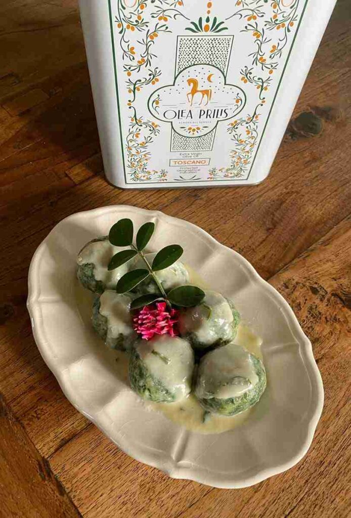 Almost all Tuscan recipes have ancient roots, most of them dating back to the Etruscan civilization. The “gnudi” are also among these. In Siena they are called “malfatti”, because they resemble something “badly made”. While in Arezzo, they are known as “gnudi”, that is “without a shirt”, because of the absence of the pasta sheet that would encase them into a ravioli. In both cases, they are large naked gnocchi-like dumplings made with ricotta cheese and green leafy vegetables, even wild ones, provided they are edible, obviously. The “gnudi” are commonly made with spinach, but you can make them with wild radicchio, or with borage (starflower), or with Sulla coronaria leaves, and you can also make them with chard, in short, you can really let your imagination go wild.