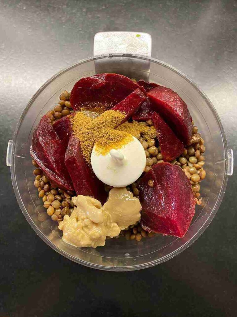 Then add to the emptied the food processor (you don’t need to wash it) the lentils and red beets, together with a generous tablespoon of tahini, the salt, garlic, the lemon juice, cumin powder and the remaining extra virgin olive oil.