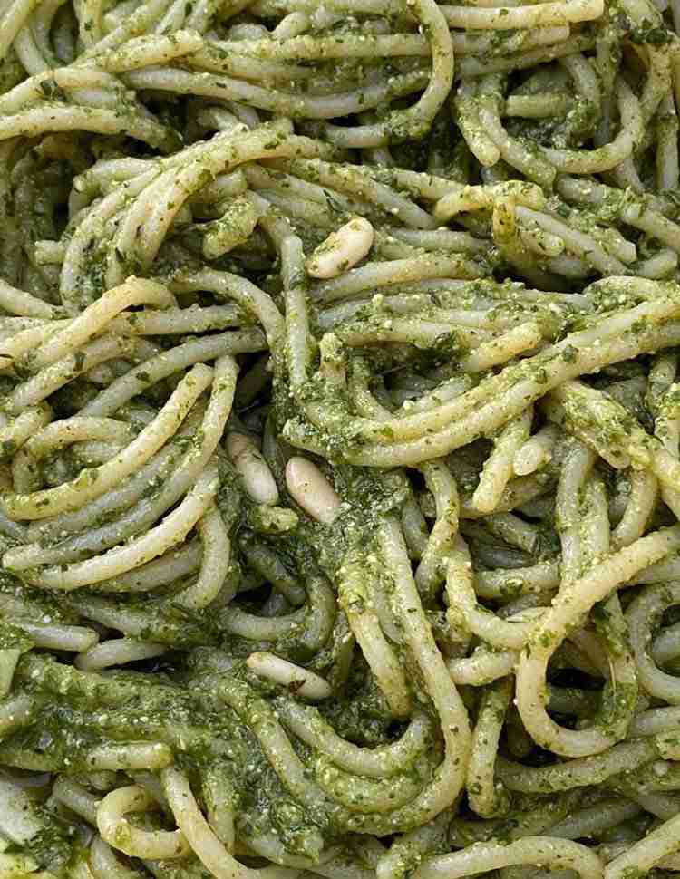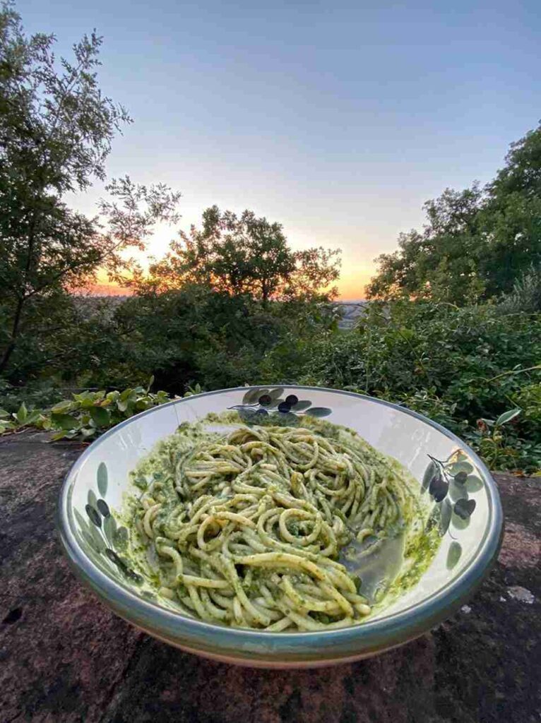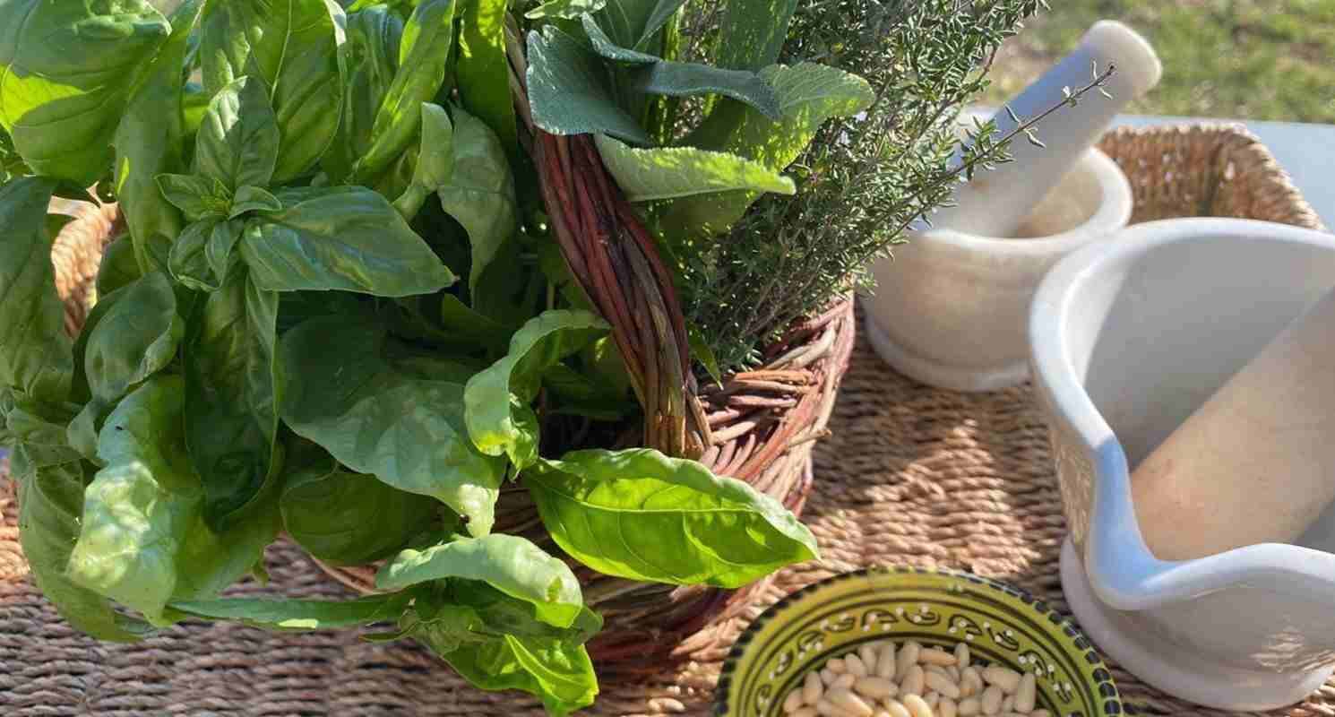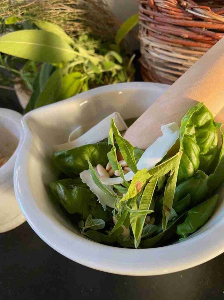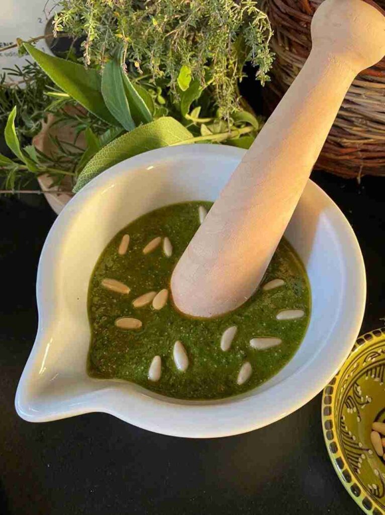 First of all, ground one clove of garlic in a pestle, and wash, dry and add basil, thyme and oregano leaves as well as some lemon balm. All these herbs should be picked fresh, with the exception of the helichrysum, which together with the others will give a characteristicflavour to the dish. Then add the pine nuts and oil, a little at a time, until you get a rather fluid sauce. Then add the pine nuts and oil, a little at a time, until you get a rather fluid sauce. dd salt to taste and let rest while the pasta is being cooked in plenty of salted water. Drain the pasta, season it with the Etruscan pesto, prinkle with goat’s cheese and some toasted pine nuts to garnis