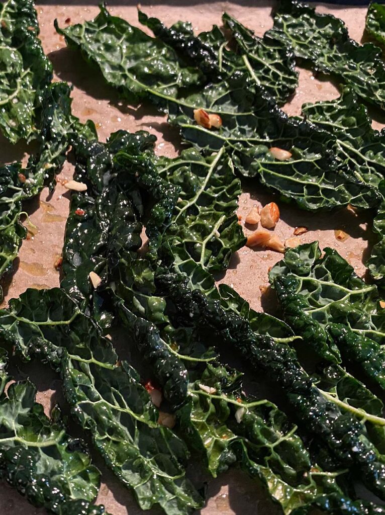 Once dressed, arrange the leaves, well distanced from each other on a oven tray lined with baking paper. Its important not to crowd the leaves on the tray in order to make crunchy “chips” the leaves must never overlap while in the oven. To avoid burning them you can leave the oven door sightly open, while constantly checking on them as they dry for about 8 to 10 minutes at a temperature of 180° C.